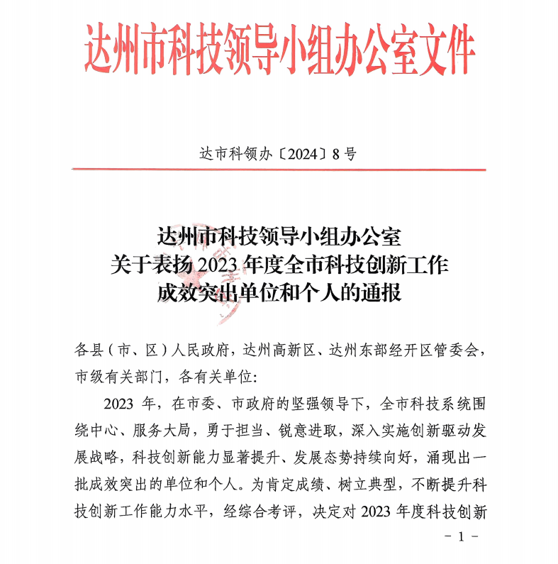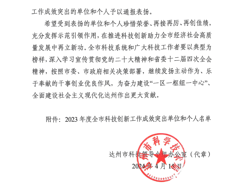 近日,达州市科技领导小组办公室下发《关于表扬2023年度全市科技创新工作成效突出单位和个人的通报》中,永利集团官网李扬磊同志荣获“2023年度全市科技创新工作成效突出个人”称号。