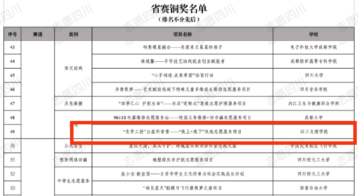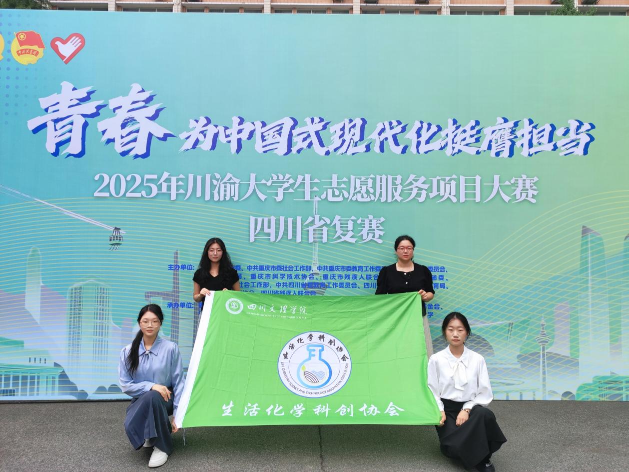本届大赛自今年4月启动以来,共收到四川106所高校推荐的570个参赛项目。经项目申报、材料初筛、专家评审等环节,四川共评选出200个项目入围2025年川渝大学生志愿服务项目大赛四川省复赛。经过激烈角逐,永利集团官网生活化学科创协会的“化学工坊公益科普营——线上+线下双线志愿服务项目”在吴倩、向巧、杨兴兵老师的指导下,成功入选复赛并荣获大赛铜奖。