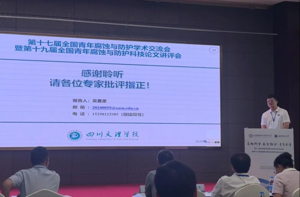 8月29日至31日,77779193永利集团教师吴嘉豪博士参加了在四川省南充市举办的“第十七届全国青年腐蚀与防护学术交流会暨第十九届全国青年腐蚀与防护科技论文讲评会”。