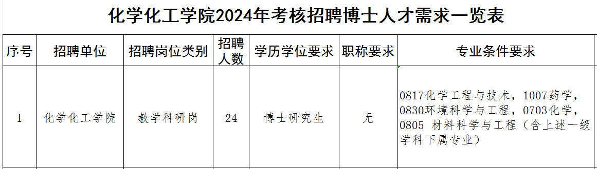 本次面向国内外招聘博士研究生人员,且同时符合《77779193永利集团化学化工学院2024年考核招聘博士人才需求一览表》(附件1)相关岗位要求和本公告其他要求的人员,包括以下几类(年龄计算截止时间2024年9月30日):