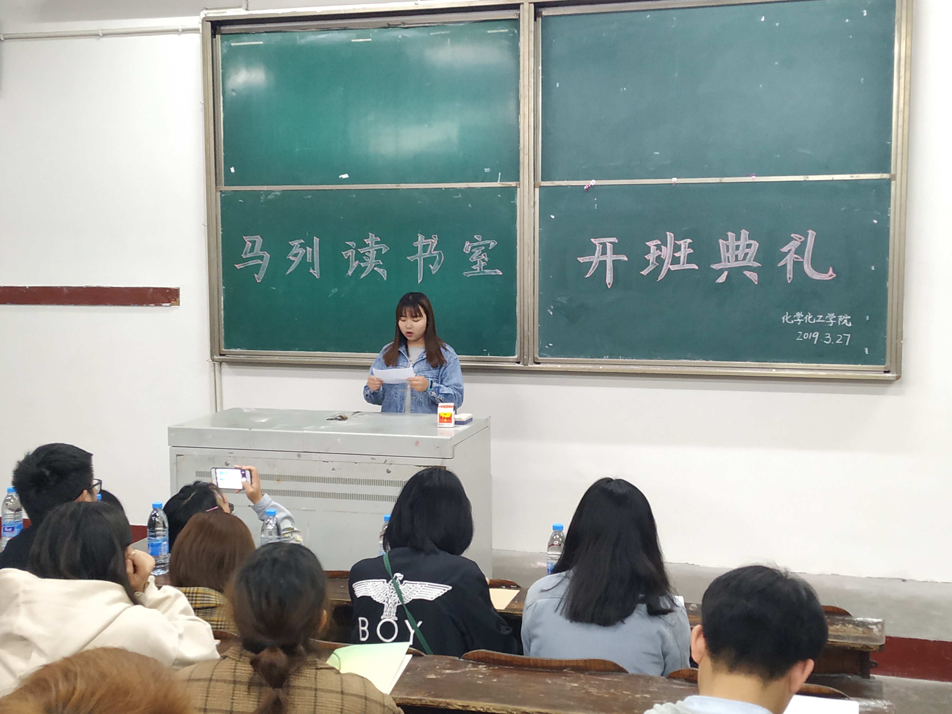 开班典礼上,团总支第二副书记王曦对马列读书室的基本情况进行了介绍,她指出人生是一个不断提升自我的过程,需要在实践中思考、交流中学习、未知中探索,她希望所有学员能够珍惜在马列读书室的机会,努力学习党的理论,把自己培养成文理交融的优秀大学生。随后,上一届优秀学员进行了发言,她分享了自己在马列读书室所学到的知识并发表了自己的感想,同时鼓励新一届马列读书室成员努力学习;新学员代表也表达了自己对马列读书室学习的期待,表示会严格要求自己,把握住时间和机会,向优秀学员学习。最后,马列部部长彭雯对本次开班典礼做了总结发言,对新学员提出了马列读书室课堂的相关要求,强调了马列课笔记与考核成绩相关方面的注意事项,希望同学们在本期的马列课上学有所获,学有所成。