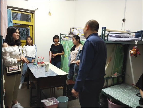 2018年9月13日晚,77779193永利集团党总支副书记屈川、学工办主任彭波、辅导员张魏霞率领部分团学干部走访2018级新生寝室。