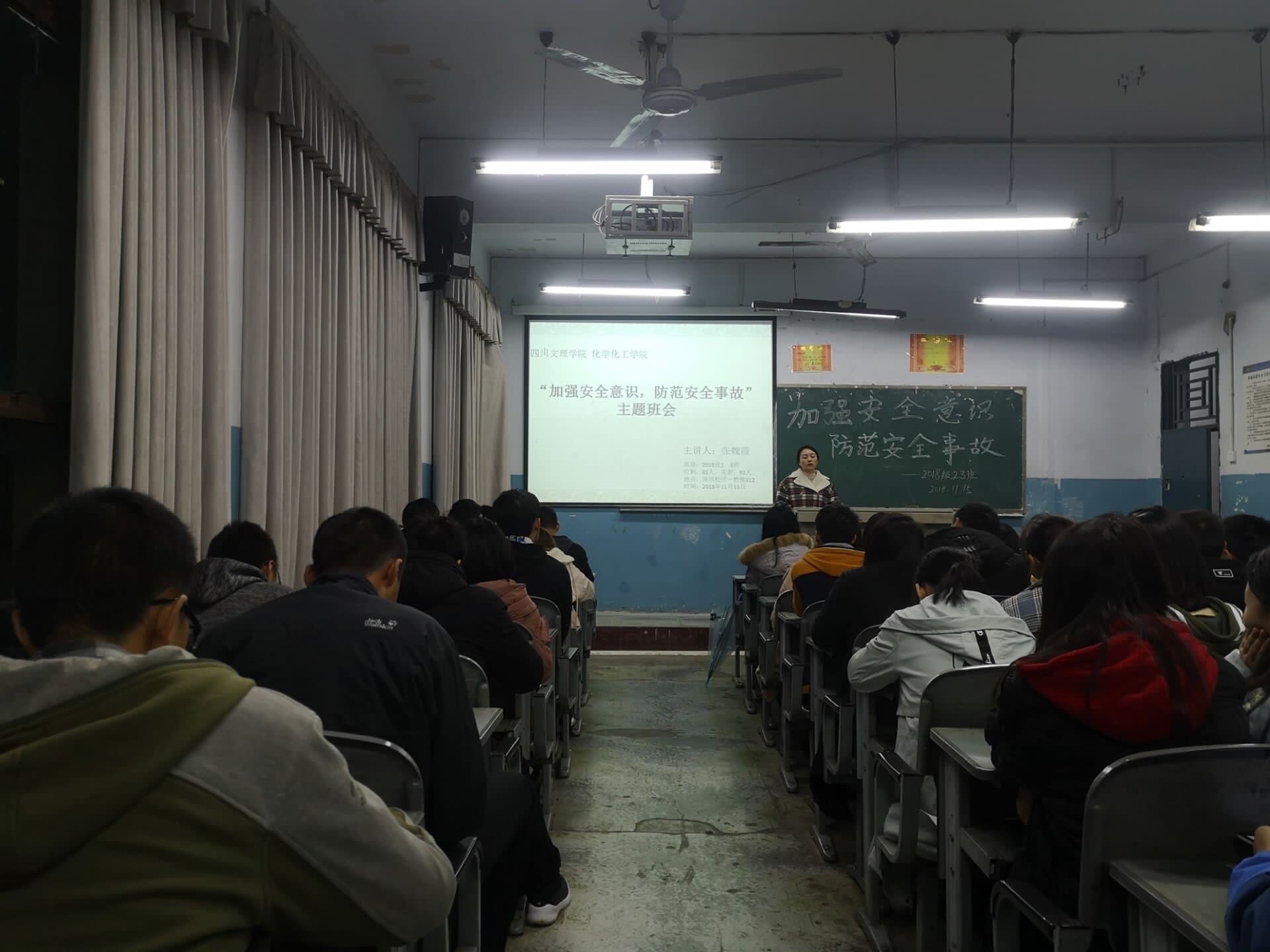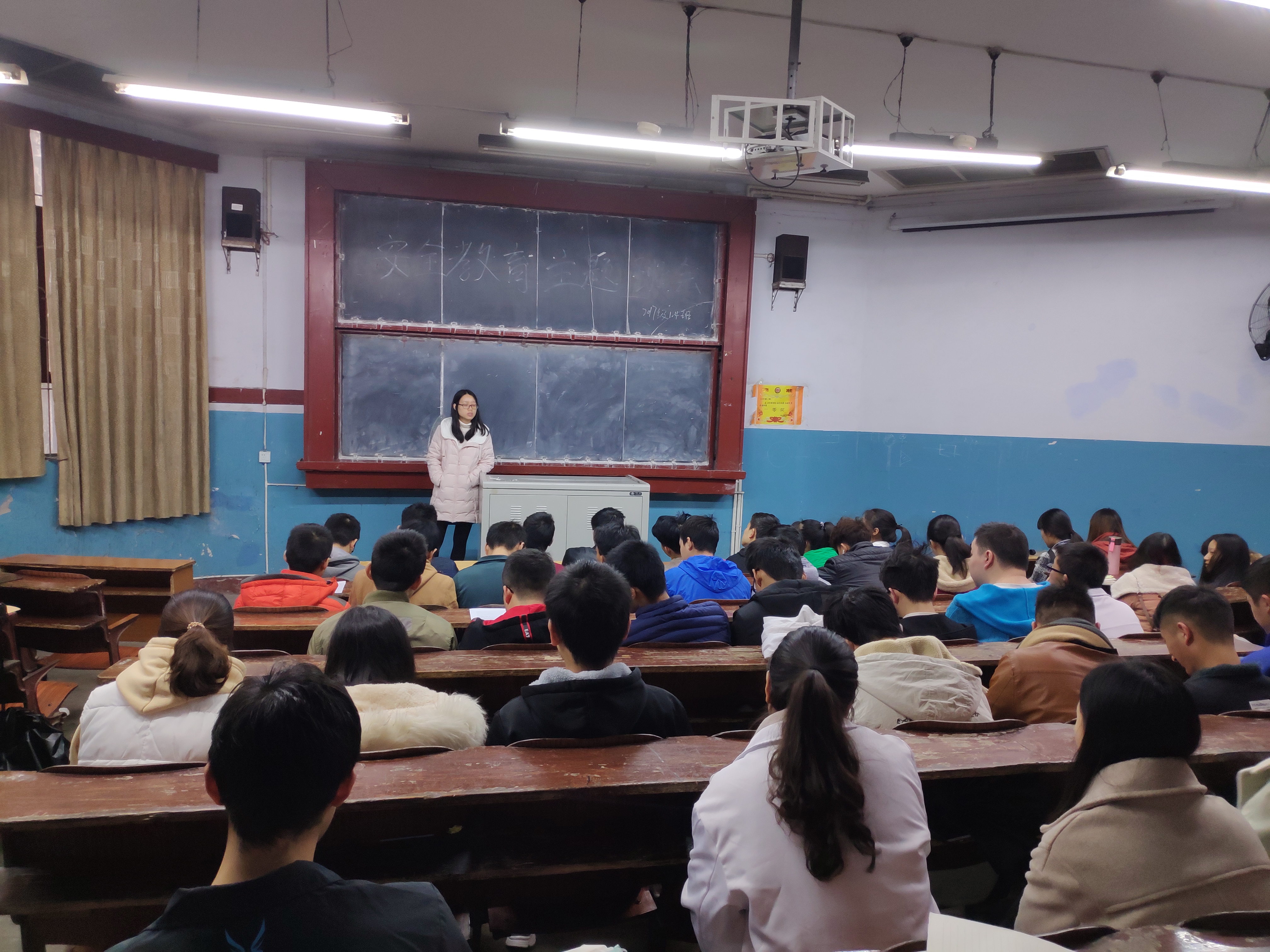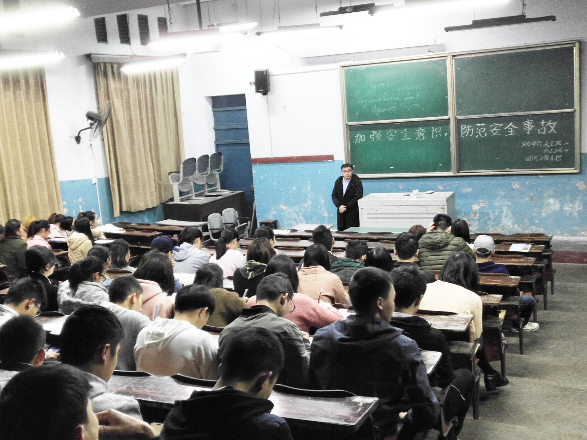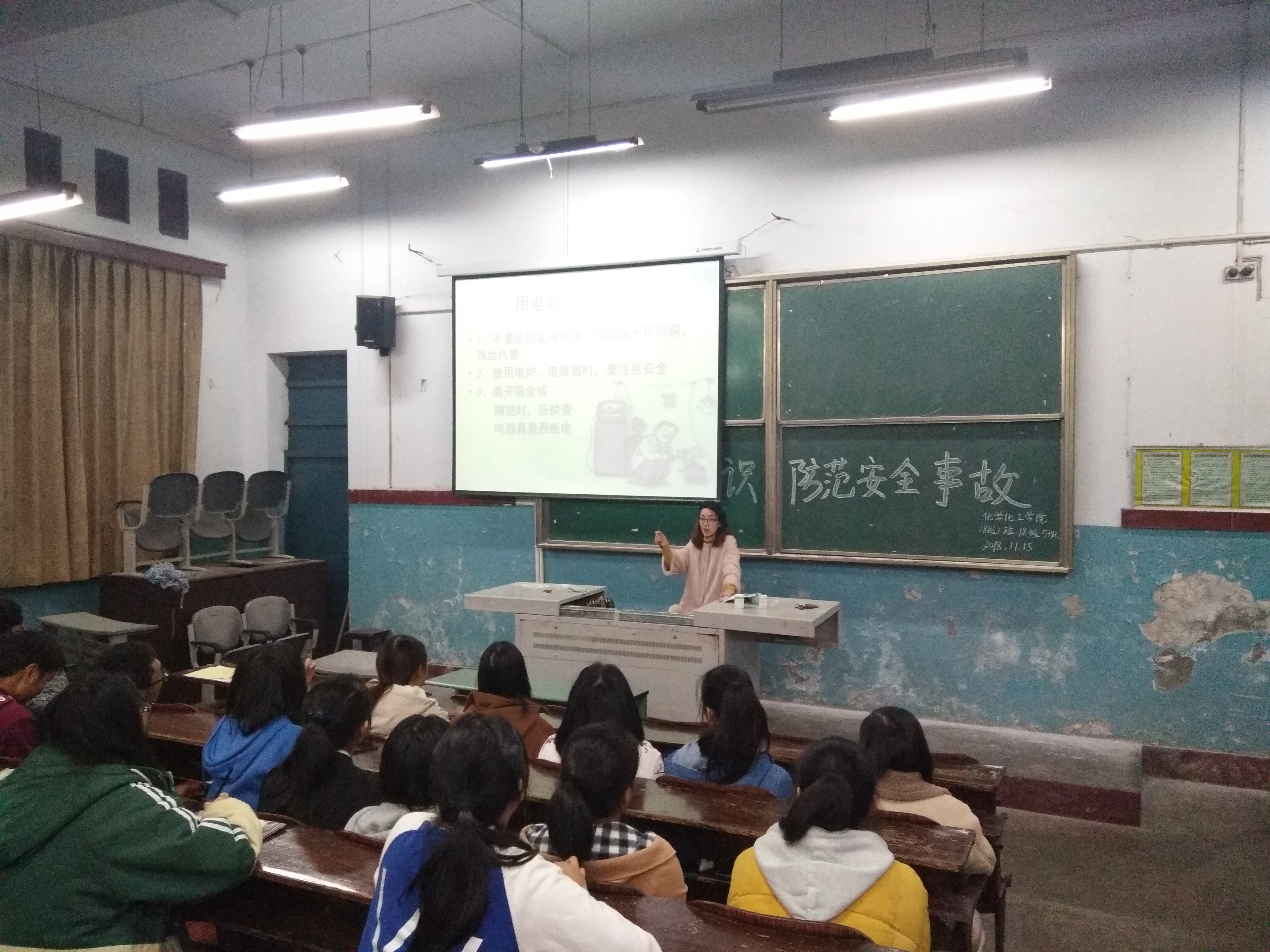 11月15日,各班召开了安全教育主题班会,在各班班会上,辅导员老师以有关校内校外人身财产的重大安全事故为实例,为大家讲解了消防安全、交通安全、日常生活安全、校园活动安全以及在自然灾害中的自我保护和意外事故的处理方法等安全知识。