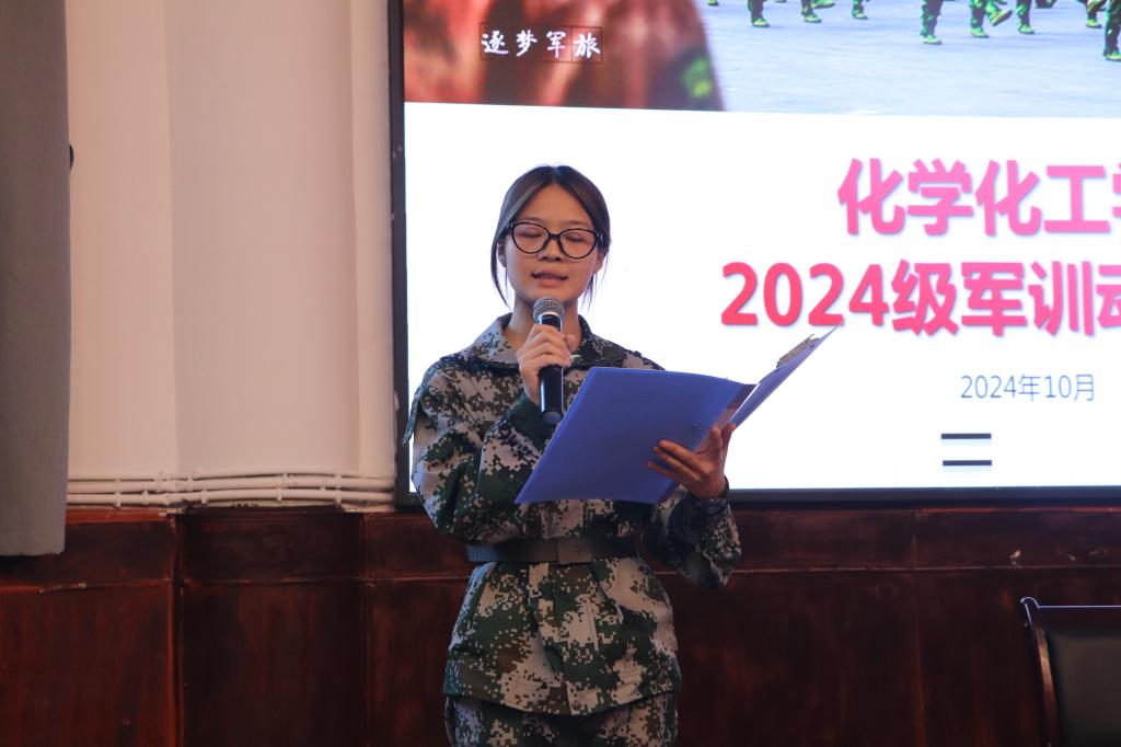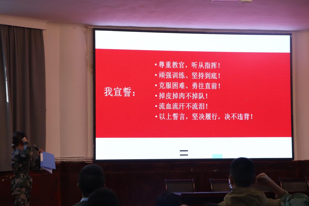大会第二项,学生代表符嘉悦上台发言,分享了她对军训的理解。她认为,军训不仅能够提升个人的身体素质,更能培养大学生吃苦耐劳的品格和良好的学习习惯。即使在和平年代,也应树立“艰难困苦,玉汝于成”的精神,保持居安思危的意识,服从纪律,认真学习,刻苦训练。大会最后,符嘉悦带领参训学生进行了庄严的集体誓师,一声声充满斗志的誓言,表达了同学们对高标准完成军训任务、坚定迎接未来挑战的信心和决心。