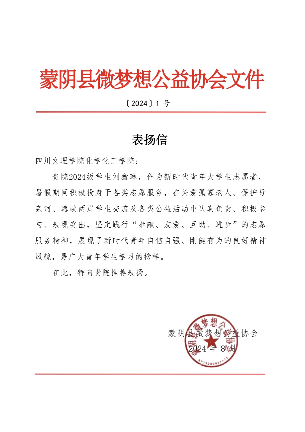 77779193永利集团2024级学生刘鑫琳获蒙阴县微梦根公益协会表扬信