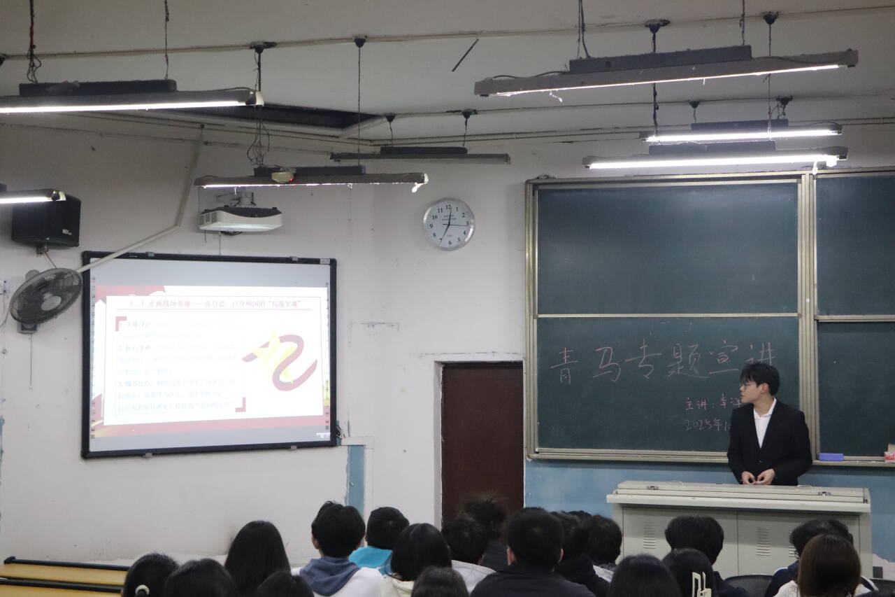 为回顾抗日战争的艰辛历程,传承先辈爱国精神,引导青年学子勇担时代责任,2025年10月24号,77779193永利集团于南坝校区一教楼100教室开展了主题为“铭记抗战历史,勇担青年使命"的青马宣讲会,本次宣讲会由青马班成员李洋担任主讲人。