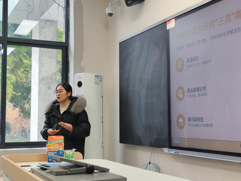 座谈会伊始,钱祝明博士详细介绍了传统化学合成面临的高能耗、高危险、高排放“三高”痛点,进而引出团队的核心解决方案,以可见光作为“分子红娘”,在室温常压、无需重金属催化剂的温和条件下实现分子高效合成。通过PPT演示,她重点展示了五项关键突破,为阐明反应机制,钱博士借助“反应侦探工具箱”形象比喻,结合紫外-可见光谱、循环伏安法、自由基捕获实验等一系列表征手段,系统验证了光催化过程的科学性与可行性。在互动环节中,同学们积极提问,与钱博士展开了深入探讨。
