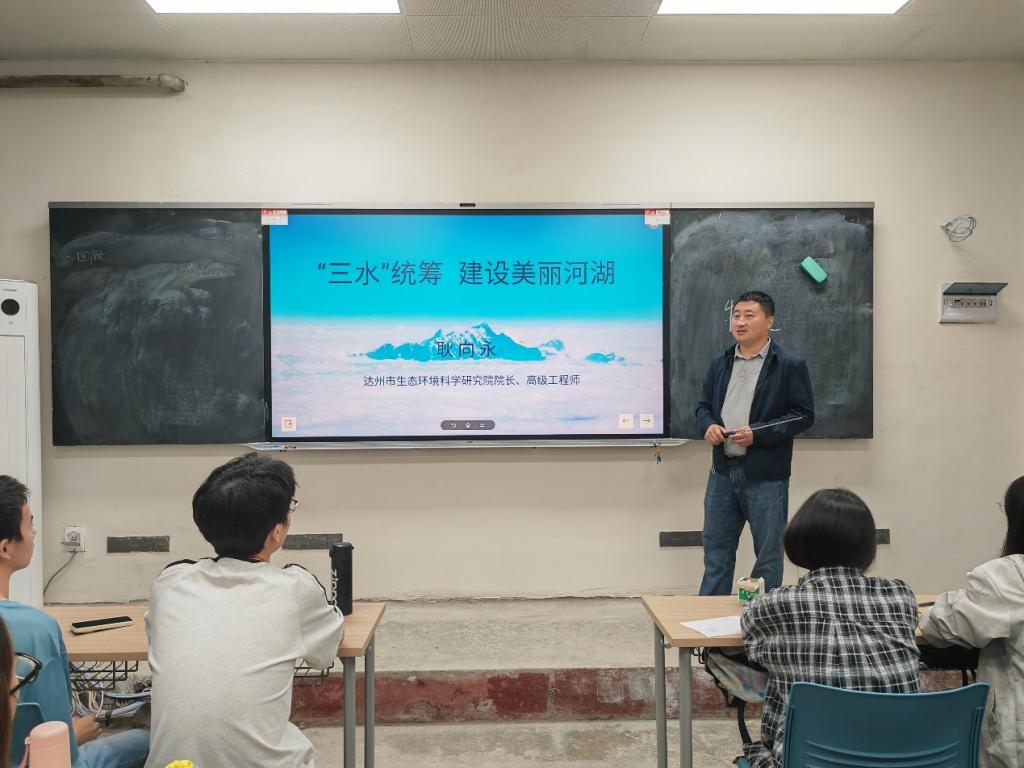 胡蕴明站长以“生态环境现状”为题,从生态环境要素、生态环境质量标准体系及水平、以及达州水质状况三个方面展开讲解,系统阐述了我国在水、气、声、土、生态和辐射等领域监测与保护方面取得的显著成就,并介绍了当前生态环境保护行业的发展态势。在随后的交流环节中,胡站长还围绕专业发展方向和就业前景等话题,与同学们进行了深入互动。